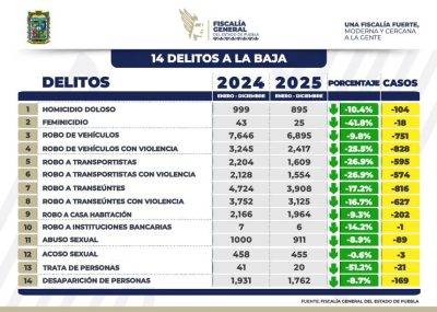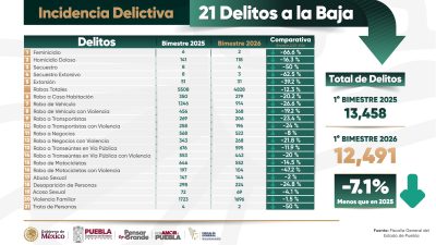 Puebla, Pue.- Durante el primer bimestre de 2026, la incidencia delictiva registró una disminución del siete por ciento en comparación con el mismo periodo de 2025, lo que se traduce en 21 delitos a la baja. «Tenemos la convicción plena, que nuestra responsabilidad coadyuvará con la seguridad, procurar la justicia y contribuir al desarrollo de la riqueza comunitaria», afirmó el gobernador de Puebla Alejandro Armenta Mier.