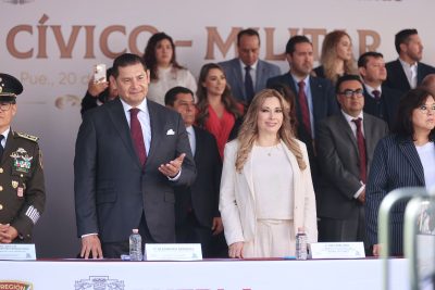 Puebla, Pue.- El gobernador Alejandro Armenta presenció el desfile cívico-militar por el 115 aniversario de la Revolución Mexicana en compañía de su esposa Ceci Arellano y de mandos de la Secretaría de la Defensa Nacional, Guardia Nacional, Secretaría de Marina, miembros del gabinete estatal y autoridades municipales. El recorrido avanzó por 2 kilómetros en el corazón de la capital poblana, desde la avenida Reforma hasta la 25 Oriente, con una duración aproximada de una hora.