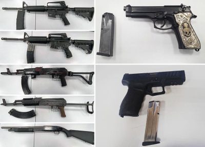 Como parte de esta intervención, fueron asegurados dos fusiles de asalto tipo AK-47, un fusil de asalto tipo AR-15, un fusil de asalto tipo Galil, una escopeta Moossberg, dos pistolas calibre 9mm, cartuchos útiles de diferentes calibres y una camioneta GMC con placas del estado de Tamaulipas.