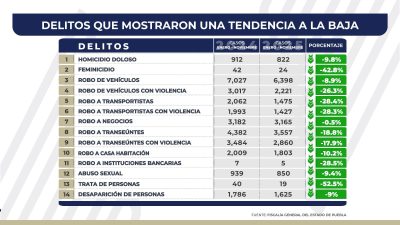 Puebla, Pue.- De enero a noviembre del 2025, Puebla registró una disminución en la incidencia de 14 delitos, derivado del trabajo en colaboración del Gobierno del Estado con la Secretaría de la Defensa Nacional (DEFENSA), Secretaría de la Marina (SEMAR), Guardia Nacional (GN), Fiscalía General del Estado (FGE) y Secretaría de Seguridad Pública (SSP).