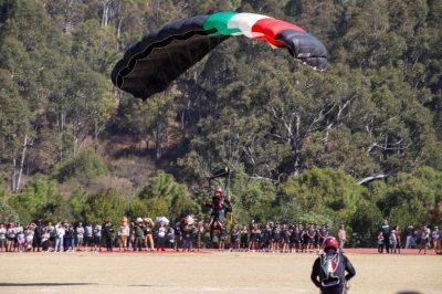 La jornada incluyó exhibiciones del equipo de alto rendimiento “Guerreros Águila”, integrado por 13 paracaidistas de caída libre —dos mujeres y 11 hombres—, así como módulos de servicios, actividades recreativas y espacios de convivencia familiar.